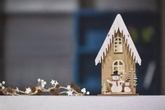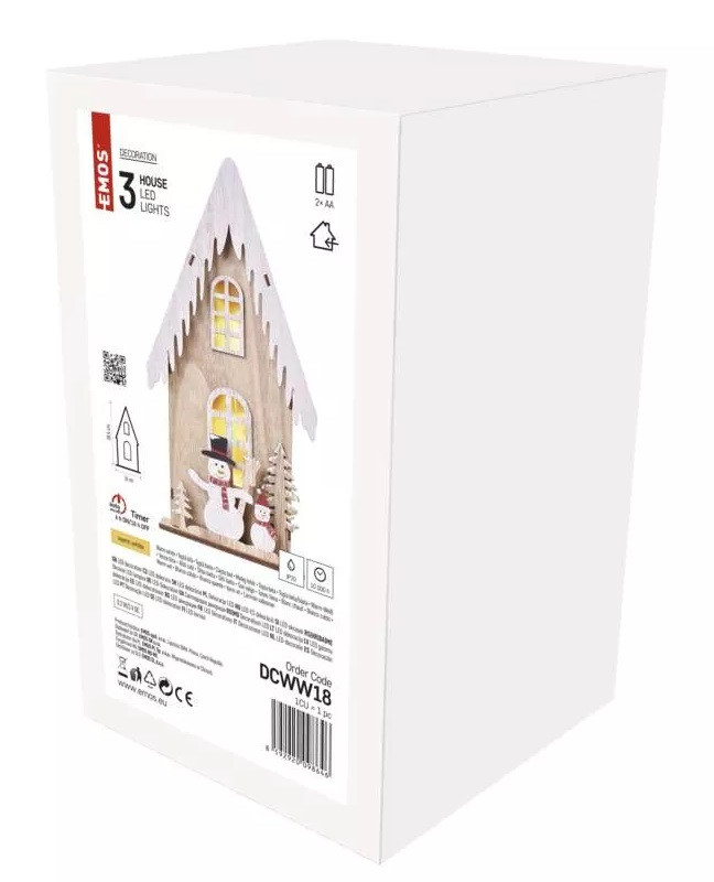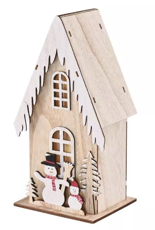 - Dekorácia drevená 3 LED – Domček 28.5 cm, 2x AA, vnútorná, teplá biela, časovač (DCWW18)