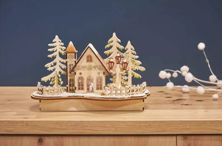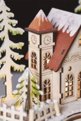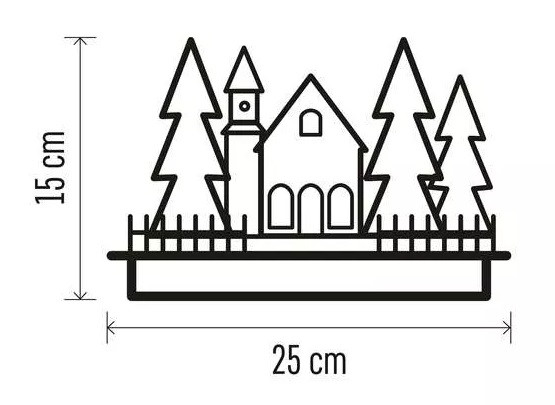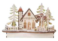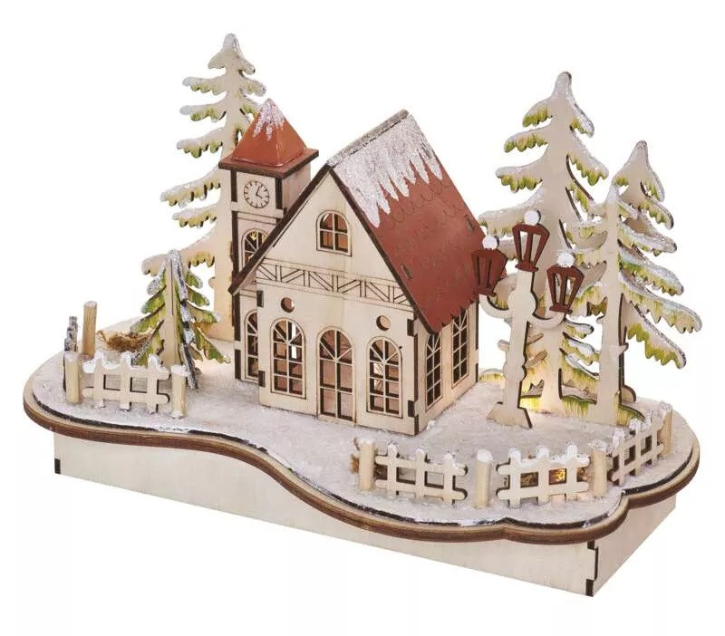 - Dekorácia drevená 5 LED – Kostol 15 cm, 2x AA, vnútorná, teplá biela, časovač (DCWW20)