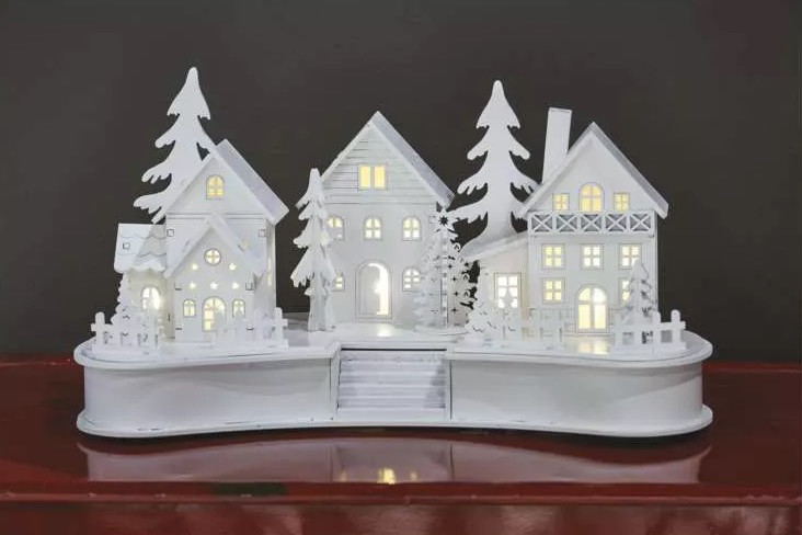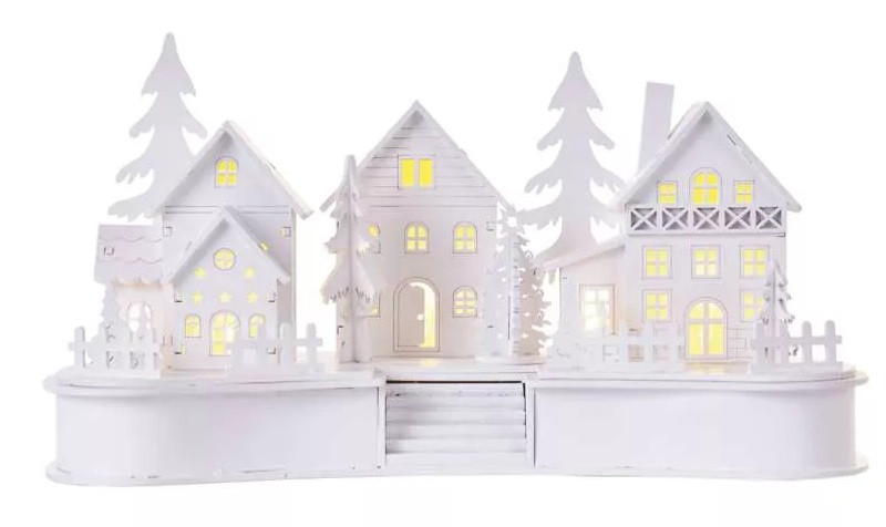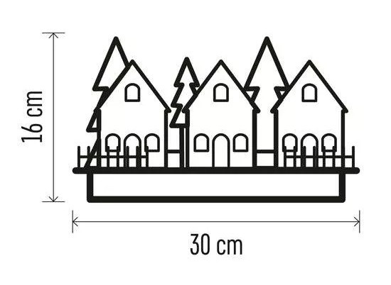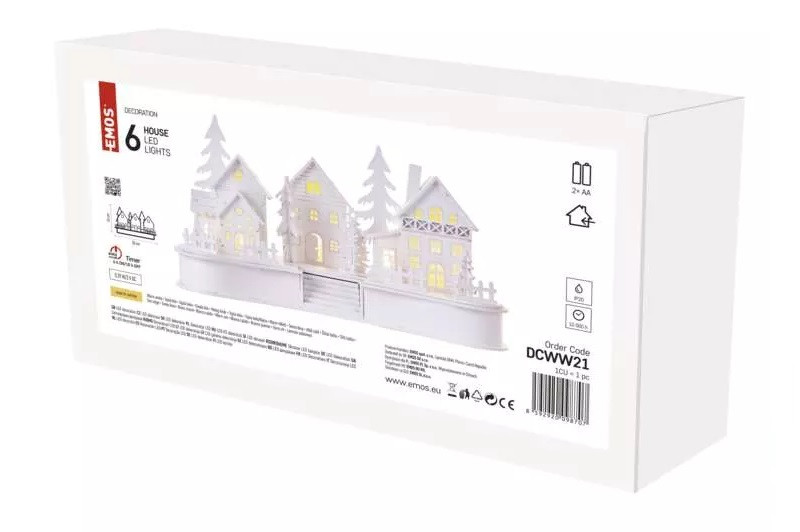 - Dekorácia drevená biela 6 LED – Dedinka, 16 cm, 2x AA, vnútorná, teplá biela, časovač (DCWW21)