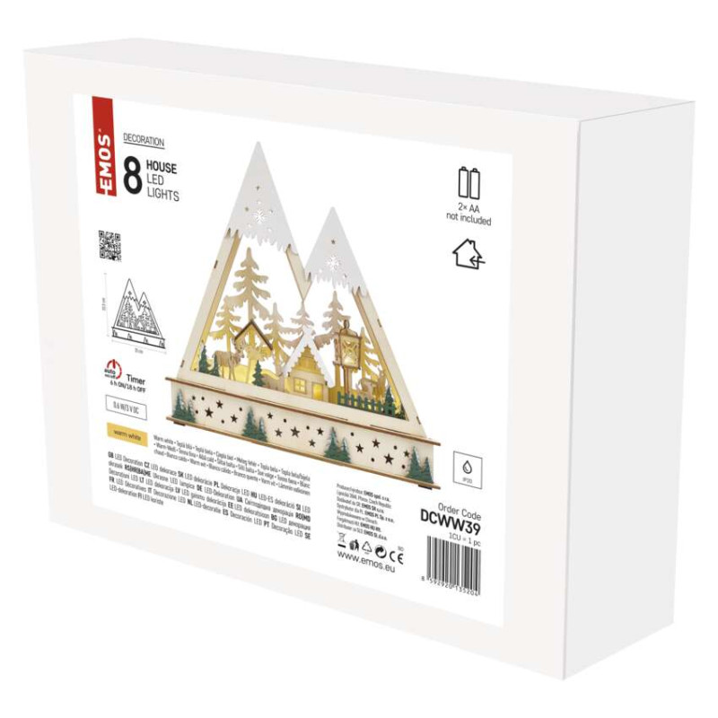 dekoráciou LED. Vyrezávaná dekorácia s motívom zasnežených hôr a